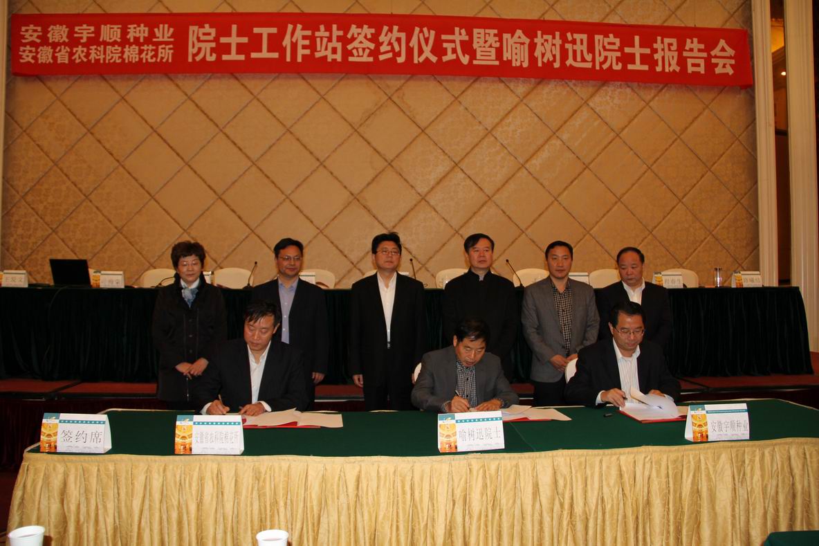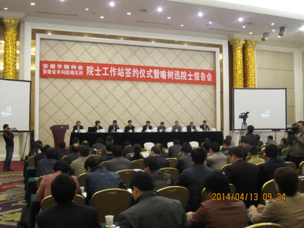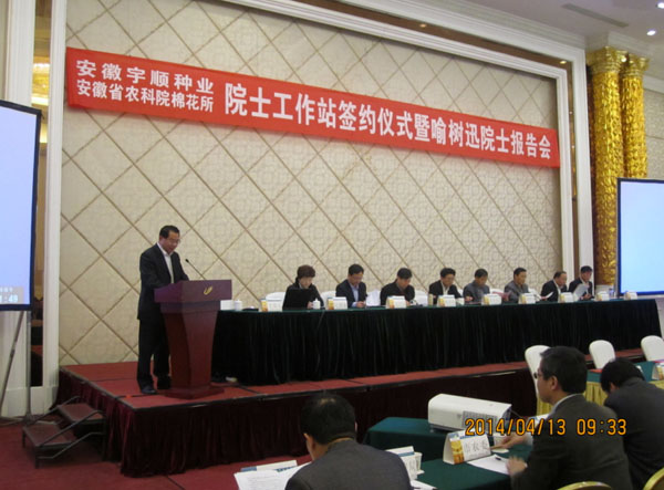 2014年4月13日上午,由中國工程院喻樹迅院士與安徽宇順種業(yè)開發(fā)有限公司、安徽省農(nóng)科院棉花所共建成立的“棉花院士工作站”簽約儀式在安慶碧桂園鳳凰酒店舉行,標(biāo)志著全市首家農(nóng)業(yè)院士工作站簽約成立。中國農(nóng)科院棉花所研究員、中國工程院院士喻樹迅,安徽省農(nóng)科院院長楊劍波以及省農(nóng)業(yè)機械推廣總站、省農(nóng)科院棉花所、國家棉花長江試驗站等部門的領(lǐng)導(dǎo)專家出席簽約儀式。市農(nóng)委、市科技局、市財政局,有關(guān)縣區(qū)農(nóng)委(農(nóng)業(yè)局)負(fù)責(zé)人和相關(guān)技術(shù)人員參加簽約儀式。簽約儀式由市政府副秘書長張仕慶主持。市政府副市長張小青在儀式上指出,安慶農(nóng)業(yè)基礎(chǔ)較好,是國家農(nóng)業(yè)部確定的棉花優(yōu)質(zhì)生產(chǎn)區(qū)域,現(xiàn)已發(fā)展為全國棉花紡織精品生產(chǎn)基地,我市的望江縣和宿松縣是全國著名的棉花百強縣。他強調(diào),院士工作站的成立契合我市農(nóng)業(yè)領(lǐng)域正在實施的“5211”工程,必將進一步提升我市棉花生產(chǎn)儲運能力和科技科研水平,為實現(xiàn)我市乃至我省棉花生產(chǎn)方式的根本變革提供技術(shù)支撐,也必將推進我市農(nóng)業(yè)產(chǎn)業(yè)化整體水平。