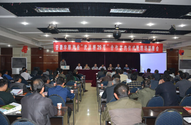 2014年10月19日上午,安徽宇順種業(yè)開發(fā)有限公司“武運粳29號”合作簽約儀式暨現場觀摩會在合肥肥西三河國際大酒店隆重召開。