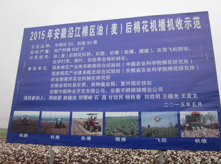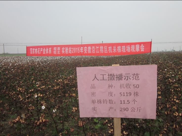 由中國農(nóng)業(yè)科學(xué)院棉花研究所、安徽省農(nóng)業(yè)科學(xué)院棉花研究所、安徽宇順種業(yè)開發(fā)有限公司聯(lián)合在安慶布點(diǎn)示范的2015年安徽沿江棉區(qū)油(麥)后棉花機(jī)播機(jī)收示范取得圓滿成功。2015年11月3日—11月5日,分別在安徽省農(nóng)業(yè)科學(xué)院棉花研究所及宿松、望江示范點(diǎn)舉行機(jī)收現(xiàn)場觀摩會,安徽宇順種業(yè)總經(jīng)理王發(fā)文率公司相關(guān)技術(shù)人員參觀機(jī)收現(xiàn)場。